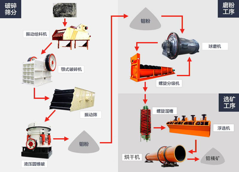 大塊的鉬礦石經料倉由振動給料機均勻地送進顎式破碎機進行粗碎;粗碎后的鉬礦石經過振動篩篩分后,由皮帶輸送機送到液壓圓錐式破碎機進行細碎;